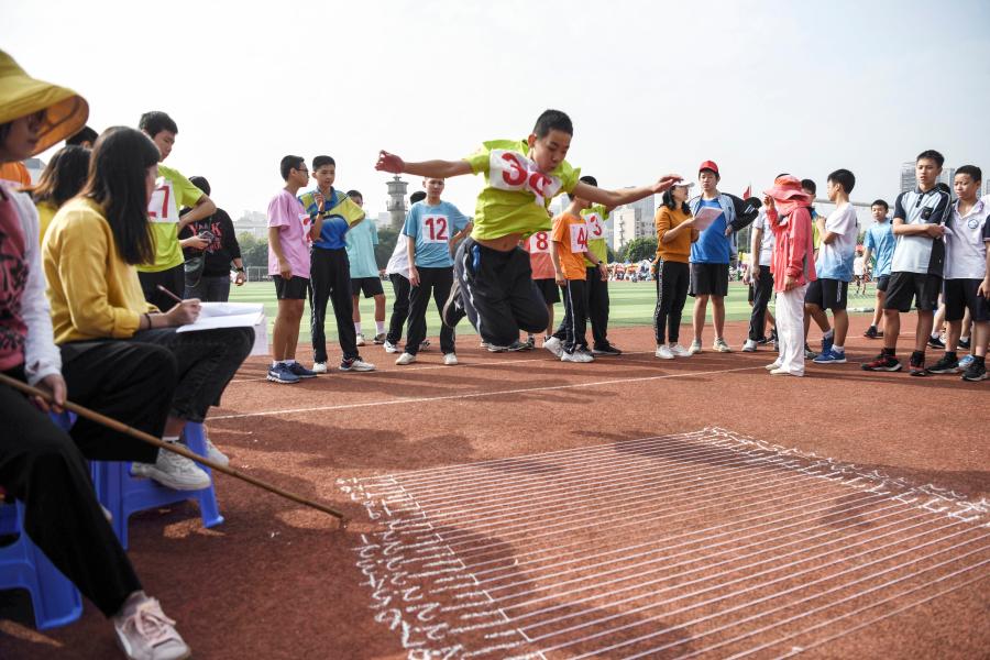 11月26日, 廣西大學(xué)附屬中學(xué)初中年級(jí)學(xué)生在立定跳遠(yuǎn)比賽中。新華社記者張愛林?jǐn)z