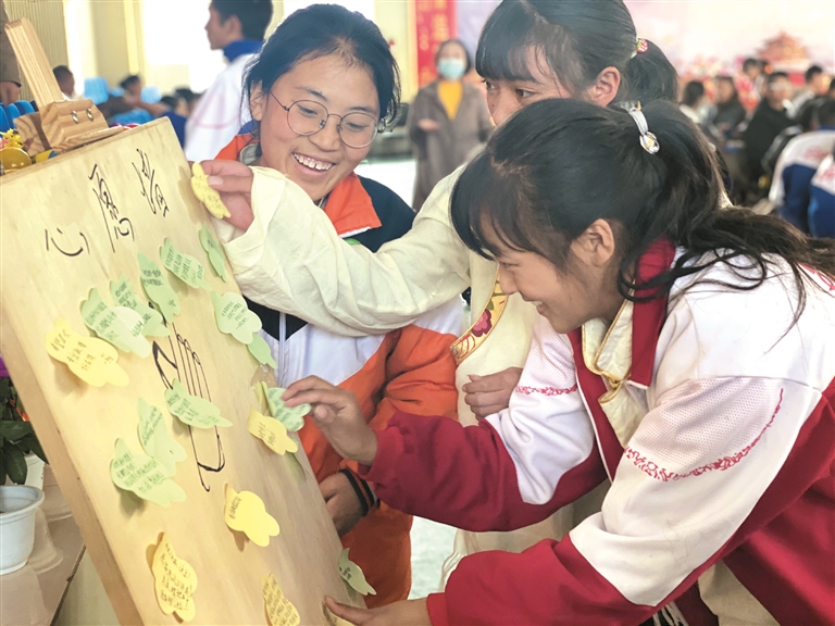 圖為學(xué)生在心愿墻上貼上自己的心愿。 旦增拉珍攝