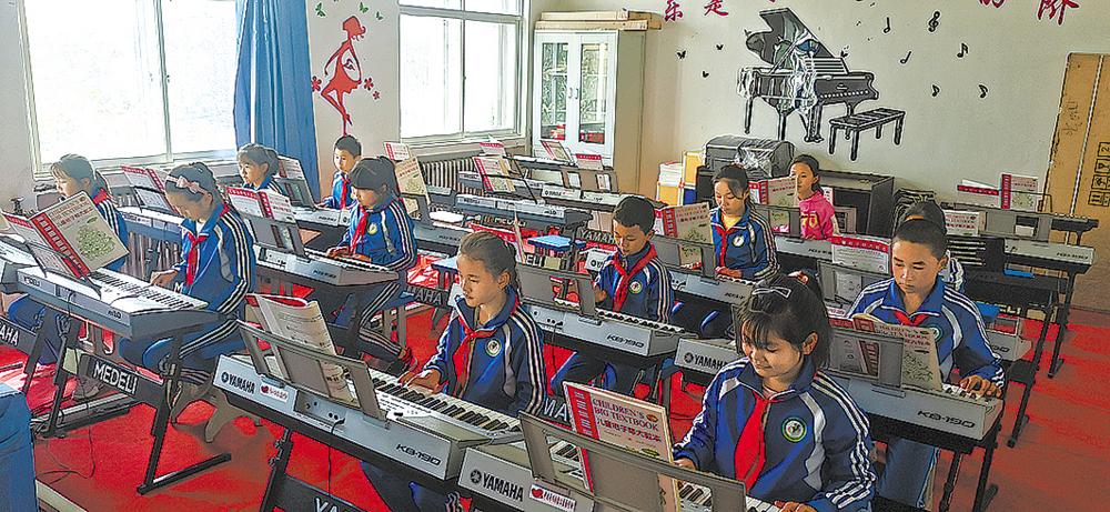 尖扎縣中學(xué)孩子們?cè)趯W(xué)校少年宮學(xué)習(xí)電子琴。