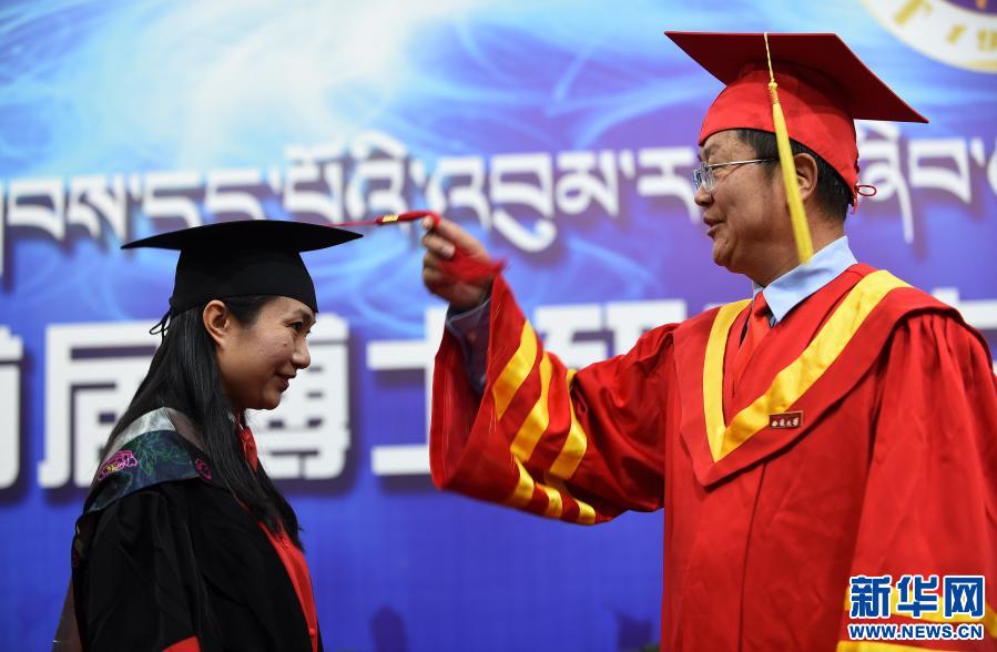 2017年11月10日,西藏大學(xué)舉行首屆博士研究生畢業(yè)典禮,向4名畢業(yè)生授予博士學(xué)位。圖為西藏大學(xué)校長紀(jì)建洲給博士畢業(yè)生張慧撥流蘇。新華社記者 覺果 攝