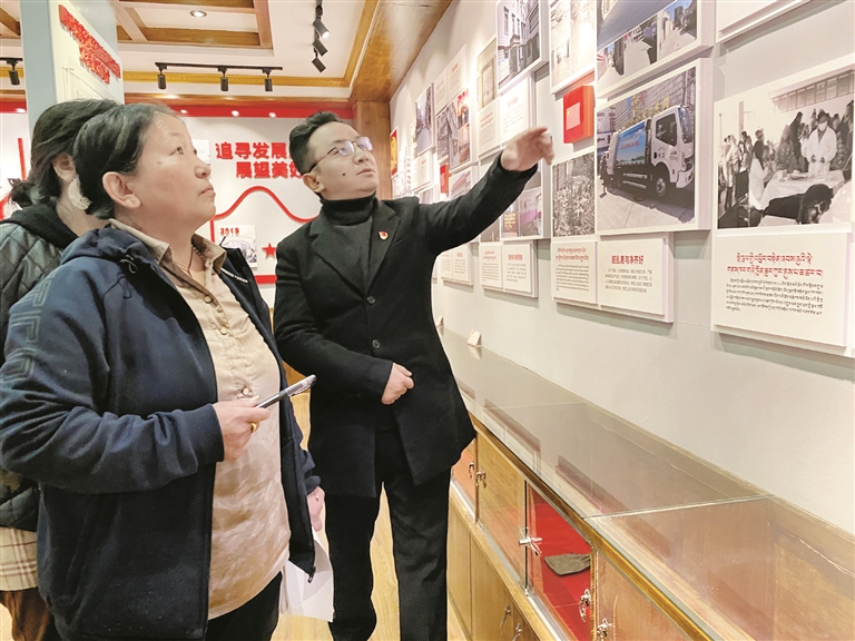 圖為在嘎瑪貢桑社區(qū)居委會“居史館”內(nèi),社區(qū)黨總支副書記、居委會主任尼瑪次仁帶領轄區(qū)干部群眾了解社區(qū)歷史。 拉薩融媒記者 旦增拉珍攝