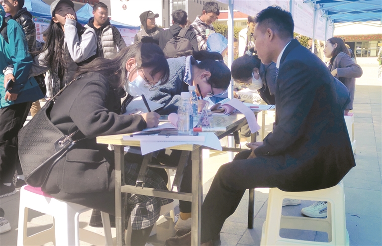 拉巴占堆是西藏大學藏語言文學師范專業(yè)的一名大四畢業(yè)生,他曾在拉薩北京實驗中學實習過,對教育工作充滿熱情。招聘會現(xiàn)場,他向卓夢培訓等教育相關企業(yè)都投遞了簡歷?!拔彝读藥追莺啔v了,希望能夠找到和自己專業(yè)相關的工作,實現(xiàn)自己的價值?!崩驼级颜f。