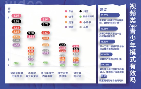 面對目前各平臺青少年模式良莠不齊的現(xiàn)狀,參與測評的大學生也有自己的見解。在剛剛畢業(yè)1年的95后教師姜煒眼里,部分軟件青少年模式下推薦的內(nèi)容不能滿足青少年的興趣?!昂每匆曨l給我推薦的都是動畫片,我教的高中生不太感興趣;小紅書的青少年模式入口有點難找,找到以后推薦給我的都是考研相關(guān)內(nèi)容,對未成年人來說可讀性不高;斗魚、虎牙這類直播平臺,本身大部分都是游戲類內(nèi)容,青少年模式下幾乎大多數(shù)內(nèi)容都會被屏蔽,我相信任何使用這兩款軟件的青少年都不愿意使用青少年模式?!辈贿^,他給抖音和B站打了高分。“這兩款軟件的推送內(nèi)容除了有興趣類的,還有一些名師課程,符合青少年的興趣?!?/p>