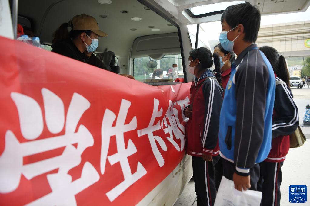 碌曲縣藏族中學(xué)高一新生帶著行李通過測溫門到學(xué)校報到(8月30日攝)。新華社記者 陳斌 攝