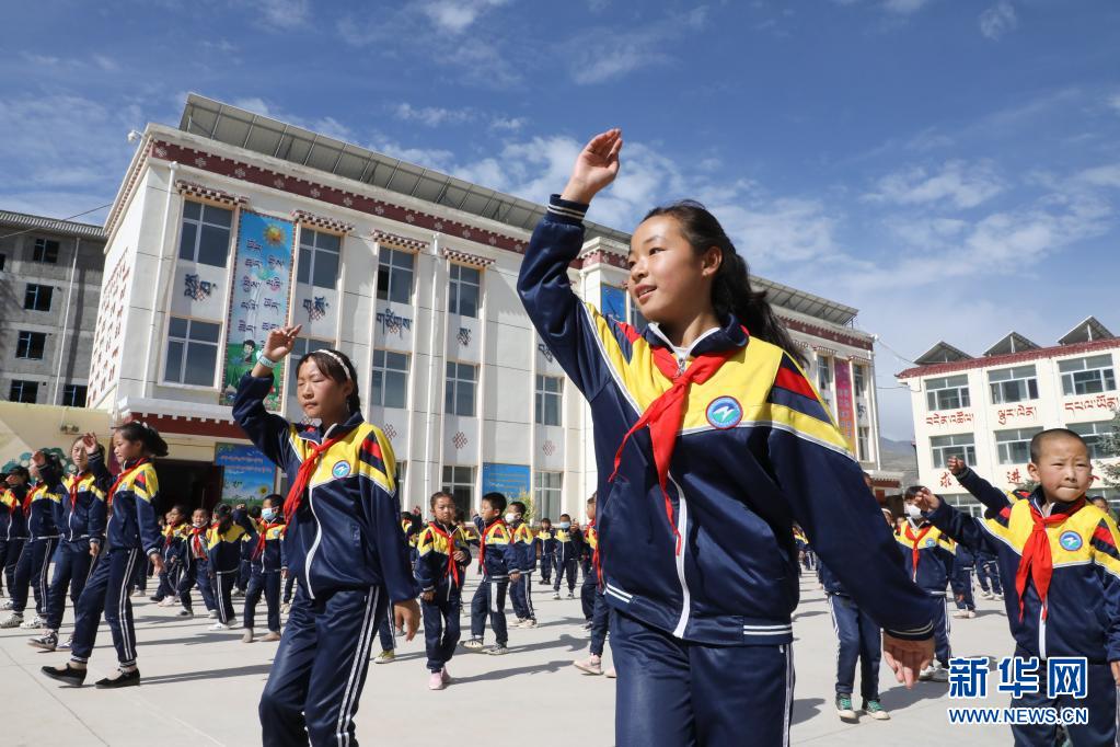 9月2日,黃南藏族自治州同仁市熱貢藝術(shù)完全小學(xué)的學(xué)生在跳“鍋莊”課間操。新華社記者 馬千里 攝