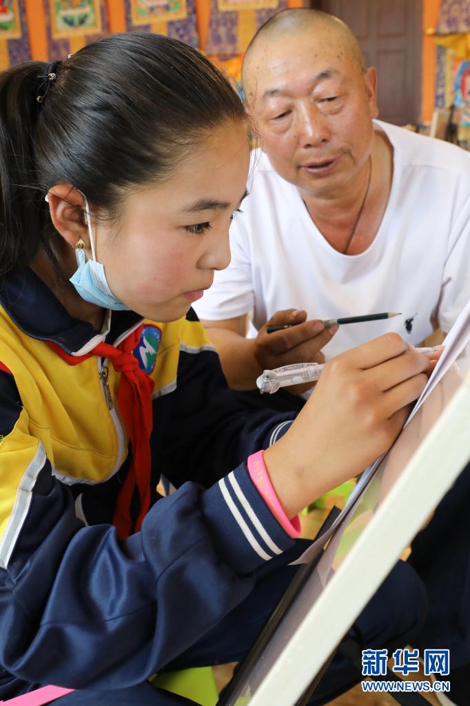 9月2日,黃南藏族自治州同仁市熱貢藝術(shù)完全小學(xué)六年級(jí)學(xué)生才讓央宗在唐卡繪畫老師旦巴的指導(dǎo)下畫畫。新華社記者 馬千里 攝