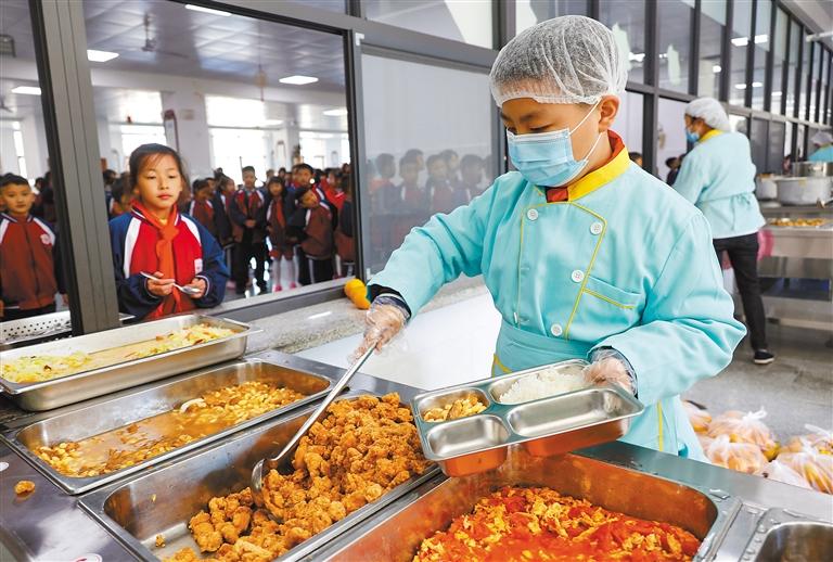 圖為11月10日,紅星小學學生在食堂窗口為同學分餐。新華社發(fā)(李肅人 攝)