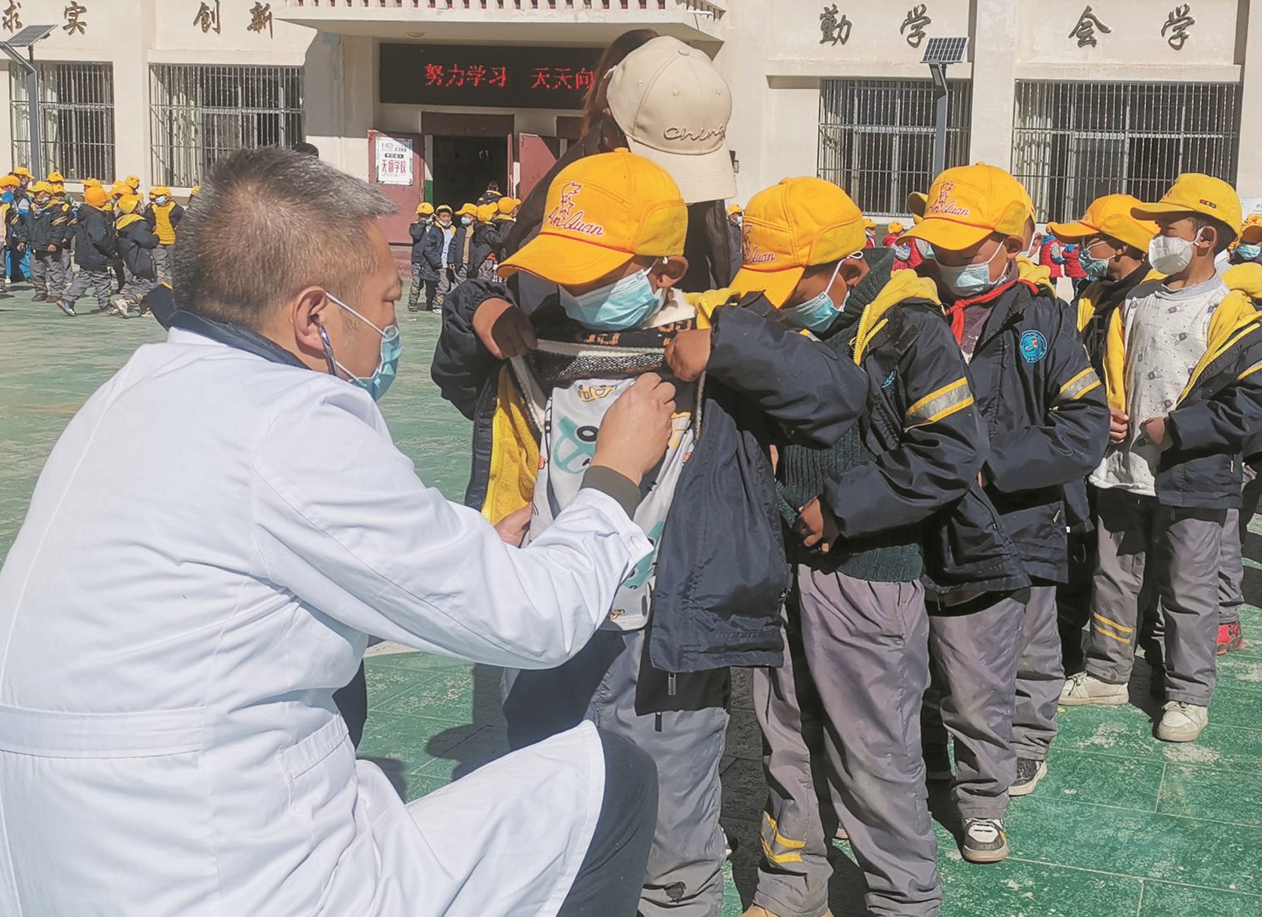 圖為醫(yī)療專家為墨竹工卡縣尼瑪江熱鄉(xiāng)小學(xué)的學(xué)生進(jìn)行聽診器檢查。拉薩融媒記者 白 央攝