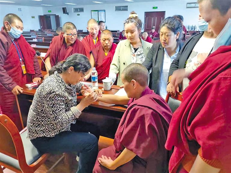 圖為明吉措姆教授在基層為僧尼群眾號(hào)脈。圖/文 本報(bào)記者 曉勇