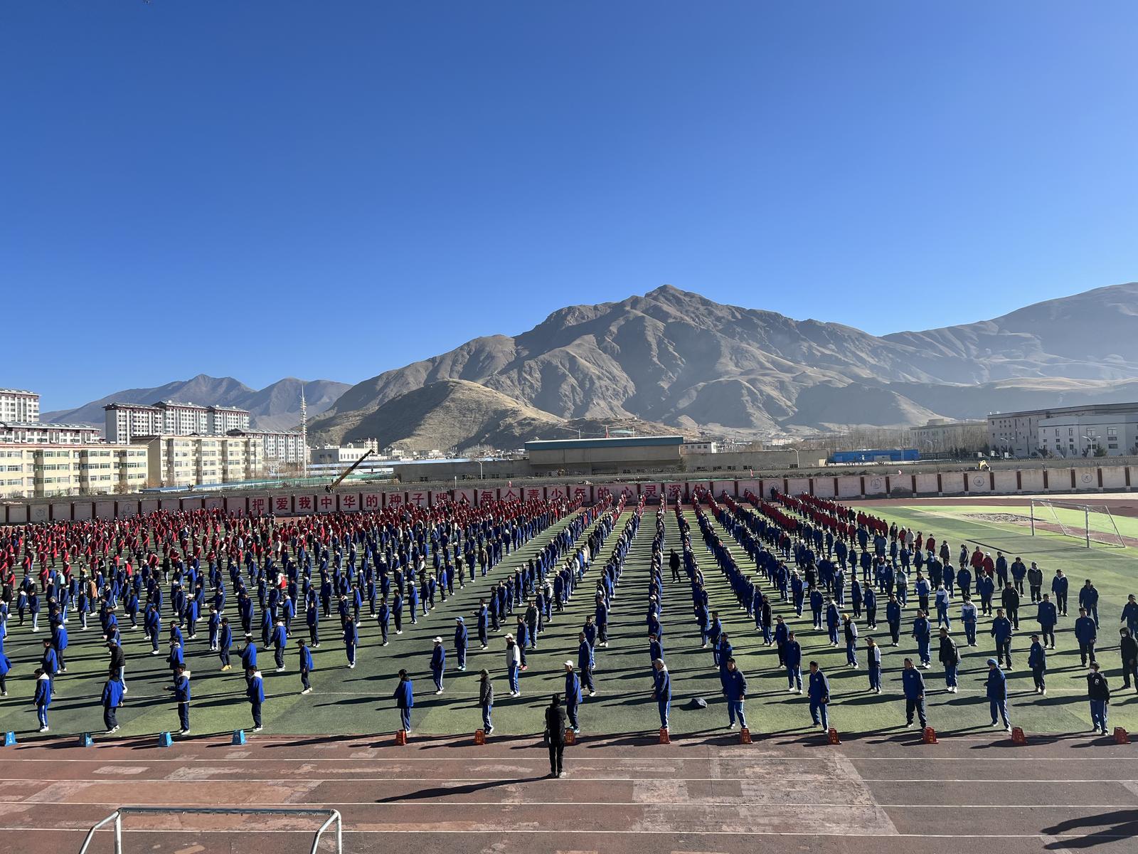 圖為全校學(xué)生正在做“鍋莊舞”課間操。