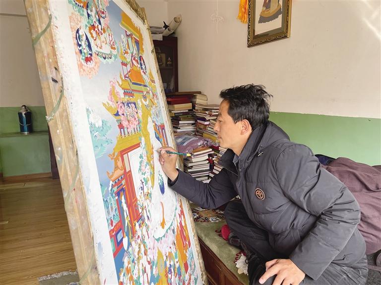 貢覺(jué)杰正在創(chuàng)作唐卡。
