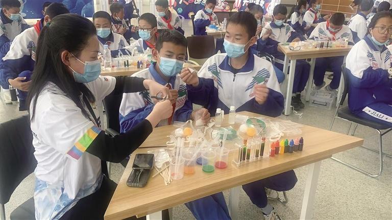 西藏自然科學博物館科普輔導員指導參與學生同步體驗“天宮課堂”科學實驗包操作。記者 王靜 攝