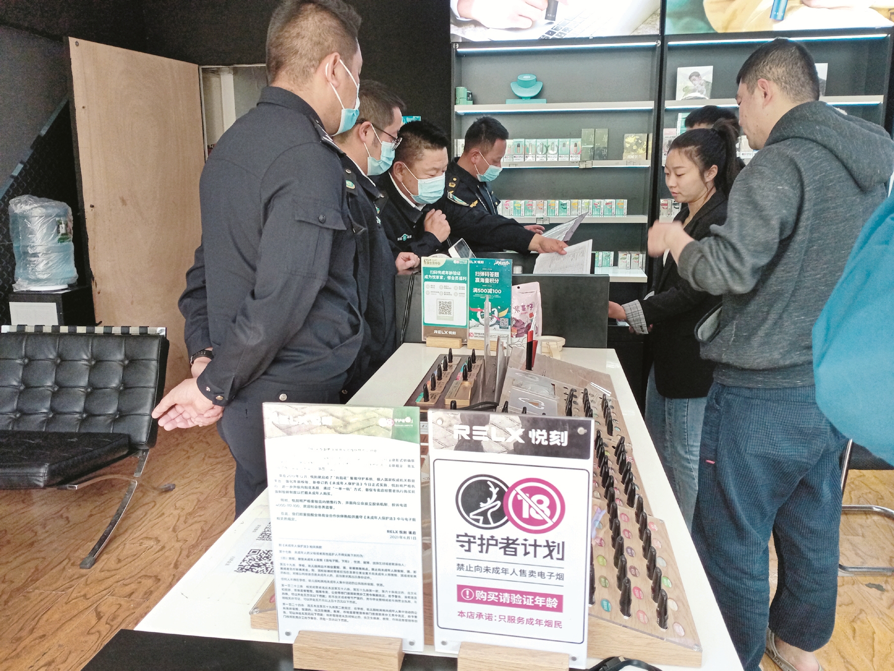 4月25日上午,市公安局和市煙草專賣局等四部門工作人員在柳梧新區(qū)聯(lián)合開展了電子煙銷售網(wǎng)點檢查。每到一個電子煙銷售網(wǎng)點,執(zhí)法人員會詳細查看銷售網(wǎng)點是否具有相關(guān)經(jīng)營資質(zhì)、是否設(shè)立不得向未成年人售賣電子煙警示標志以及身份證件核驗等規(guī)定落實情況,并向電子煙經(jīng)營者進行相關(guān)法律法規(guī)宣傳,告知經(jīng)營者嚴禁向未成年人銷售電子煙。
