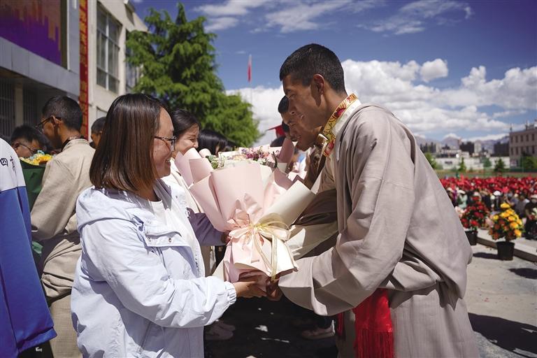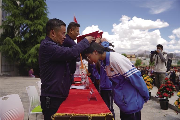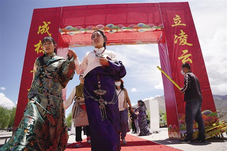 走進(jìn)拉薩市第四高級中學(xué),校園里每個(gè)角落都流露出喜悅與溫馨,同學(xué)們身著色彩鮮艷的民族傳統(tǒng)服裝,帶著自信的笑容,在父母與老師的陪伴下,走過“成人門”,踏上“成才路”,通向“成功門”。此時(shí)的他們意氣風(fēng)發(fā),青春的面龐如同朝陽一般閃爍著光芒,滿懷豪情地憧憬精彩的人生。高三學(xué)生朗色占堆告訴記者:“今天是特別值得紀(jì)念的日子,以后我們都是成年人了,會(huì)勇于承擔(dān)責(zé)任,對自己的行為負(fù)責(zé),努力成為一個(gè)有知識、知感恩、有責(zé)任、有擔(dān)當(dāng)?shù)男聲r(shí)代新青年。”