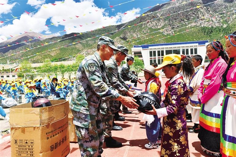 官兵代表向?qū)W生們捐贈(zèng)禮品。