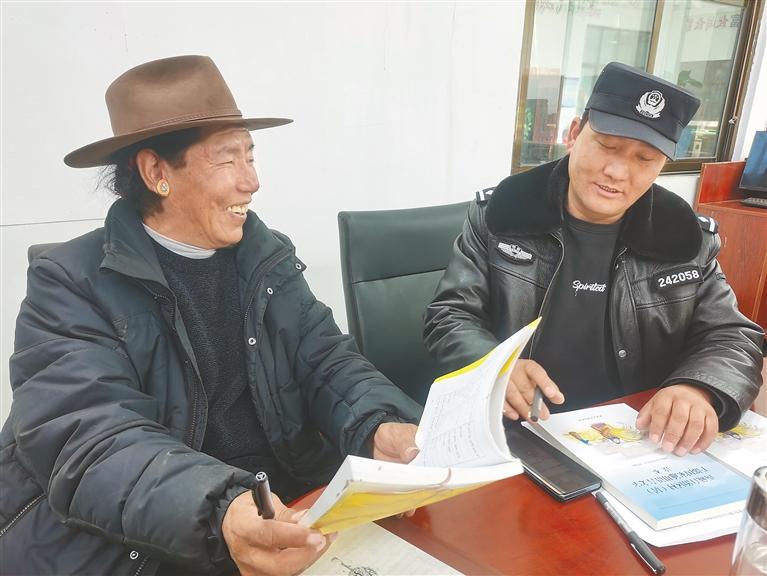 圖為聶孜村第一書記旦增(右)與村黨支部書記米瑪(左)正在用國家通用語言進行情景模擬對話。記者 汪純 攝