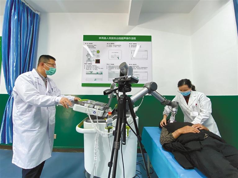 蘇州市援藏工作組引進(jìn)第一臺(tái)5G遠(yuǎn)程超聲機(jī)器人。圖為醫(yī)生使用遠(yuǎn)程超聲機(jī)器人為患者檢查。