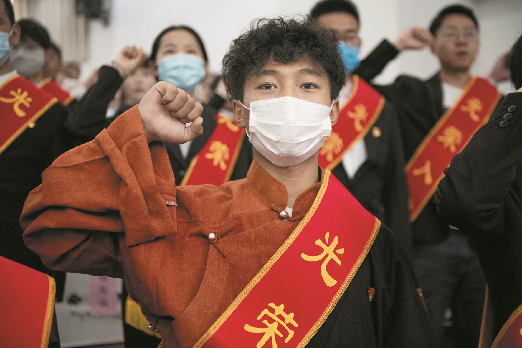 圖為西藏大學(xué)理學(xué)院19級新入黨學(xué)生拉巴平措在黨旗前莊嚴(yán)宣誓。拉薩融媒記者 玉珠多杰攝