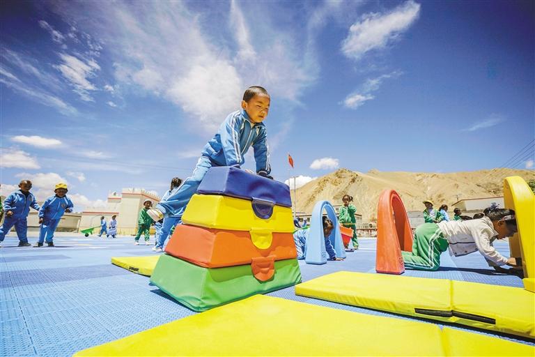 圖為扎西宗鄉(xiāng)完全小學附屬幼兒園的小朋友在新建的操場上玩耍。 記者 袁海霞 攝