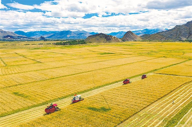 努力把資源優(yōu)勢轉化為發(fā)展優(yōu)勢,做大做強高原特色產(chǎn)業(yè),加快構建現(xiàn)代產(chǎn)業(yè)體系。2012年至2021年,城鎮(zhèn)居民和農(nóng)村居民人均可支配收入分別從18362元、5698元增長至46503元、16932元。圖為西藏自治區(qū)江孜縣紫金鄉(xiāng)青稞種植喜獲豐收。