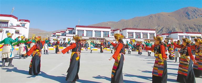 文藝事業(yè)繁榮興盛,全區(qū)共有10個專業(yè)文藝團體、76個縣區(qū)藝術團、153個民間藏戲隊、395個鄉(xiāng)鎮(zhèn)文藝演出隊,所有行政村成立群眾文藝演出隊。圖為西藏自治區(qū)扎囊縣德吉新村群眾文藝演出隊開展演出活動。