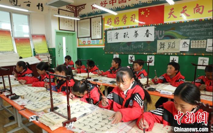 圖為玉樹市第二完全小學(xué)學(xué)生正在參加少年宮社團(tuán)課?!∮駱渲菸麄鞑抗﹫D