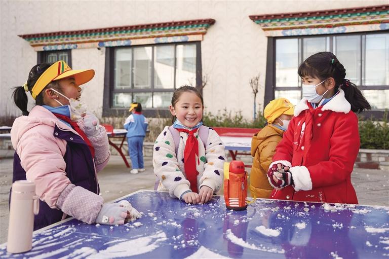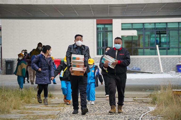除了激動的家長,學生們的心情也很激動。在校門口,扎西旺扎和索朗培塔大老遠就認出了對方,倆人快速跑向對方,雖然戴著口罩,眼里卻充滿笑意?!案袅四敲淳媒K于見面了,太激動了,很想念我的好朋友?!痹魍χf。你假期看了什么動畫片、又新學了什么東西、去哪里玩了、作業(yè)完成得如何……太久沒見了,小伙伴們再次見面,分外親熱,大家一起嬉笑打鬧著進入校園。