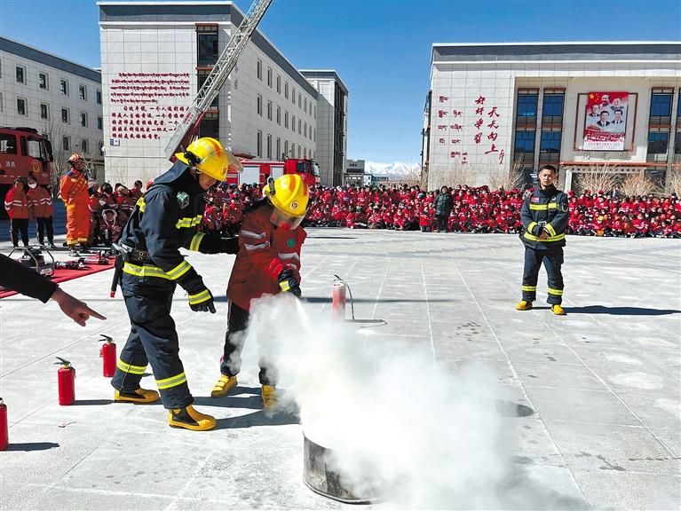 阿里陜西實(shí)驗(yàn)學(xué)校學(xué)生在“開學(xué)第一課”中體驗(yàn)消防滅火技能。普珍 記者 洛桑旦增 攝