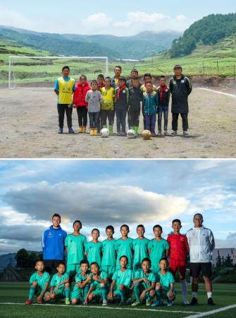上圖:2019年5月29日,在瓦吾小學(xué)的泥地足球場上,該校足球隊創(chuàng)建人曲比史古(左一)、來自長春的支教老師崔洪明(右一)和足球隊球員合影。下圖:2020年8月13日,在四川省昭覺縣拉莫足球場,歐足聯(lián)A級教練哈維爾(后排左一)、搭檔殷建淋(后排右一)與昭覺皇家馬德里足球隊球員合影,該球隊有7名來自瓦吾小學(xué)的孩子。新華社記者沈伯韓攝