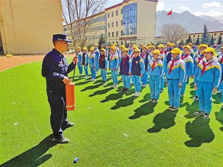 拉薩市森林消防大隊隊員在為學生講解如何使用滅火器。記者 格桑倫珠 盧文靜 攝