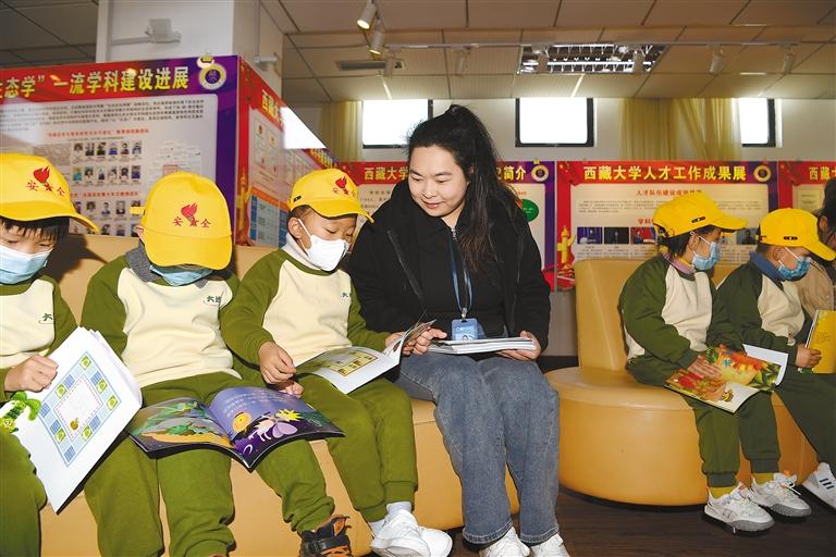 圖為西藏大學(xué)圖書館的老師與孩子們在一起閱讀繪本。記者 李洲 攝