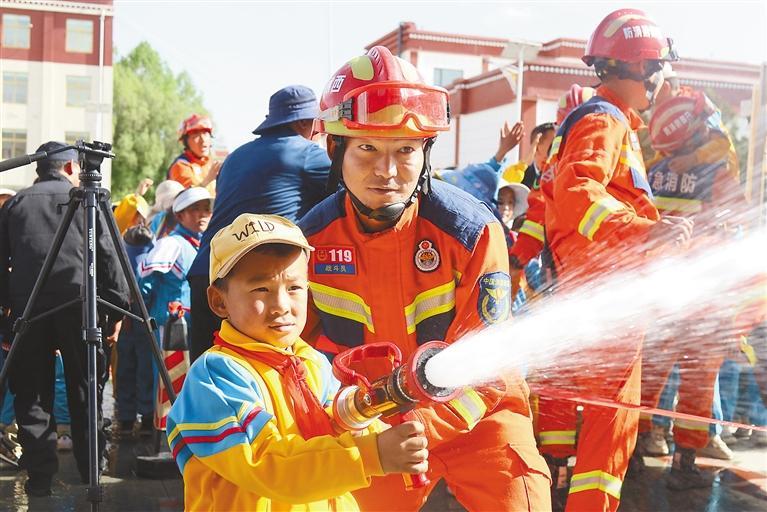 日喀則市小學(xué)學(xué)生體驗(yàn)滅火救援器材。