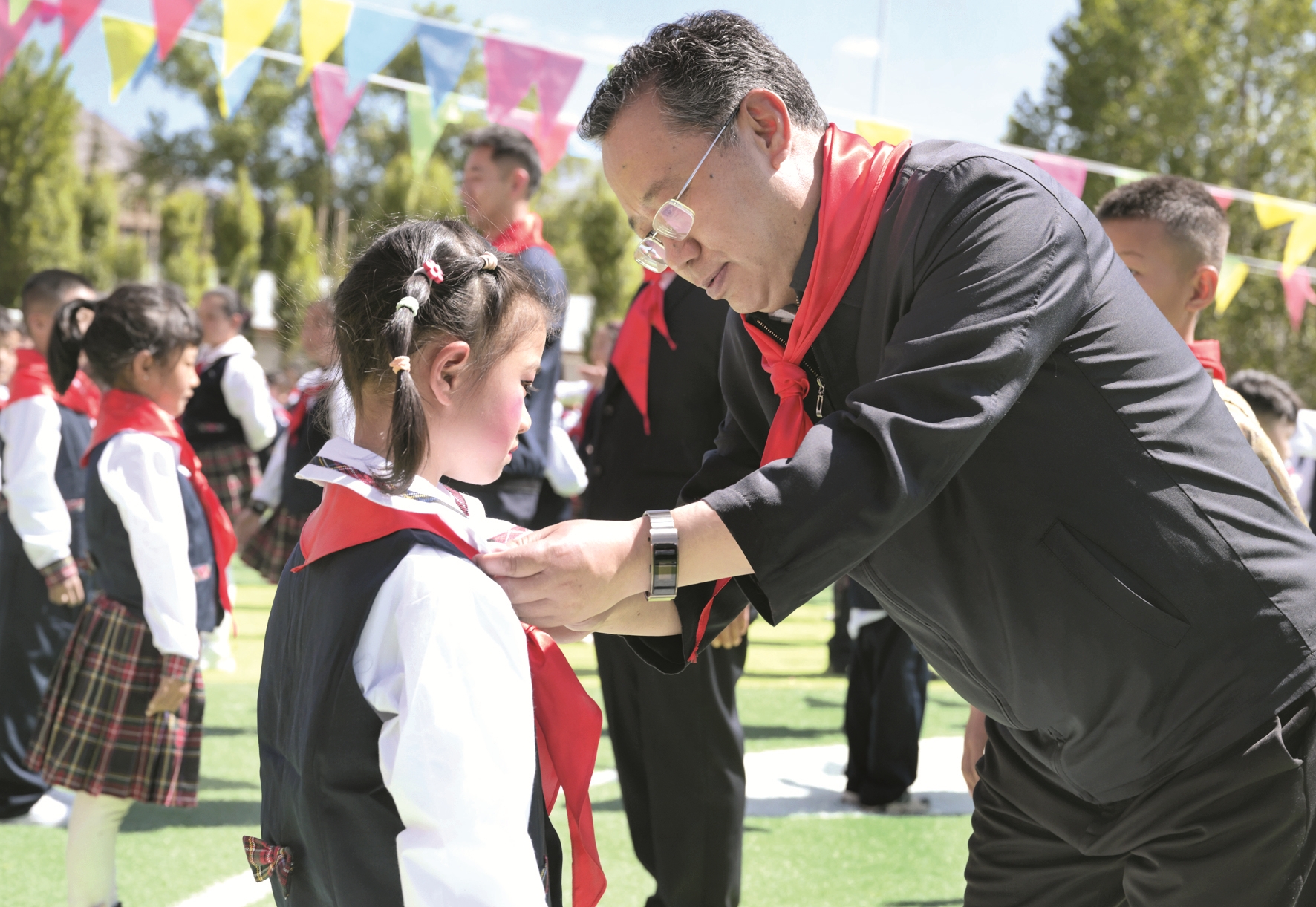 拉薩市第一小學(xué)是西藏和平解放后拉薩開辦的第一所公立小學(xué),建校70年來,為新西藏各項(xiàng)建設(shè)事業(yè)輸送了萬千棟梁人才。來到拉薩市第一小學(xué)江蘇路分校,身著民族服飾的藏族小姑娘南杰拉措為王強(qiáng)一行系上鮮艷的紅領(lǐng)巾,并熱情帶領(lǐng)王強(qiáng)一行走向校園。