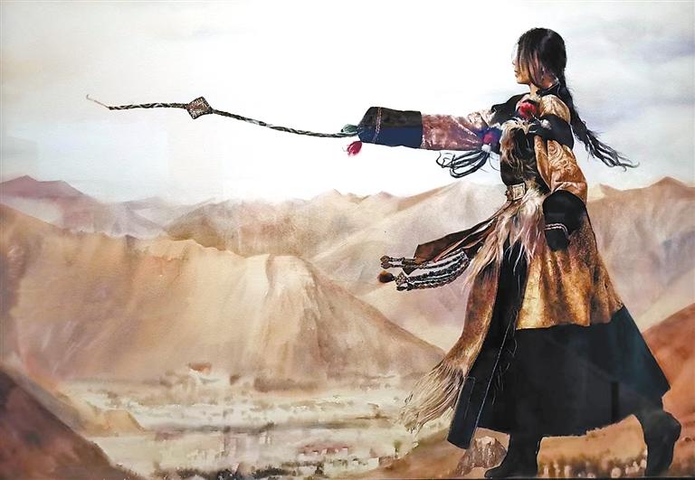中國畫作品《幸福西藏》運用工筆重彩的繪畫藝術(shù)表現(xiàn)形式,描繪了布達拉宮廣場上民族和睦的美好生活圖景。畫面中,湛藍天空下,藏族群眾與遠道而來的各地游客們相聚雪域高原,燦爛的笑容映照出新時代西藏人民的美好生活,也反映出西藏自然風(fēng)光、人文風(fēng)情對各地游客的極大吸引力。從青年旅行者們或騎著單車,或舉起相機認(rèn)真拍照的表情,能深刻感受到他們對美麗西藏的向往。同時,繪畫作品反映出近年來西藏旅游事業(yè)的蓬勃發(fā)展以及各族兒女團結(jié)互助、攜手進步的新時代美好生活景象。水彩·粉畫《颯·薩》運用人物特寫的藝術(shù)創(chuàng)作手法,展現(xiàn)出一位西藏姑娘甩出烏爾朵的颯爽姿態(tài);油畫《藏歷新年薩迦禳祈?!芬悦骺鞜崃业纳屎嫱谐霎?dāng)?shù)孛癖娺M行藏歷新年祈?;顒拥臍g樂場景;油畫《中國玉麥》以紀(jì)實敘事的創(chuàng)作方式,描繪了隆子縣玉麥鄉(xiāng)卓嘎、央宗姐妹放牧守邊的故事,畫面中她們專注地懸掛國旗的樸實舉動,傳遞出高原姊妹對祖國的深愛之情。