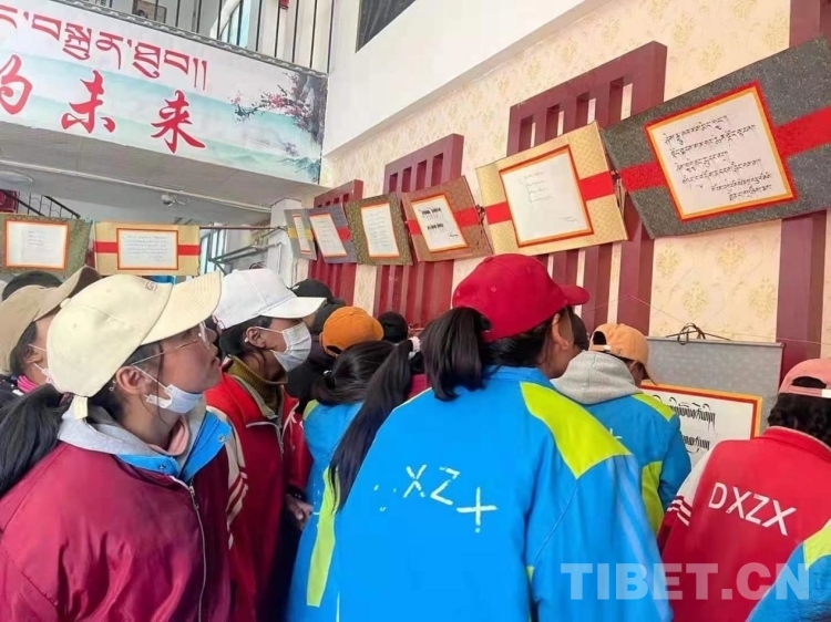 圖為學(xué)生們欣賞藏文書法作品(尼瑪加措提供)