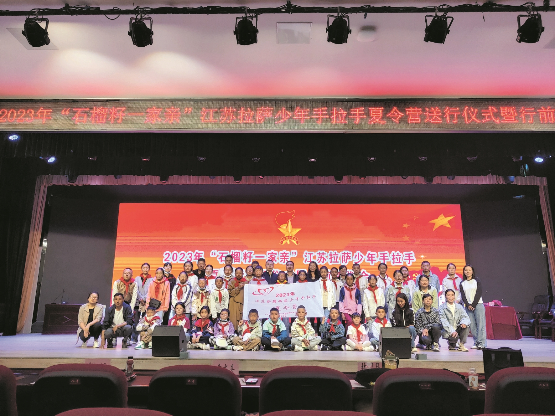 8月2日下午,2023年“石榴籽一家親”江蘇拉薩少年手拉手夏令營送行儀式舉行。圖為大家在送行儀式上合影。拉薩融媒記者 余洋洋攝