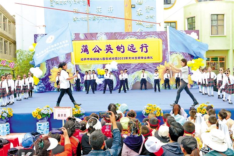 記者在拉薩市江蘇實驗幼兒園看到,學(xué)校門口鋪著紅色的地毯,大門兩邊立著寫滿祝福語的牌子,LED屏幕里滾動播放著孩子們上學(xué)期在學(xué)校的日常,處處洋溢著溫馨與愛。