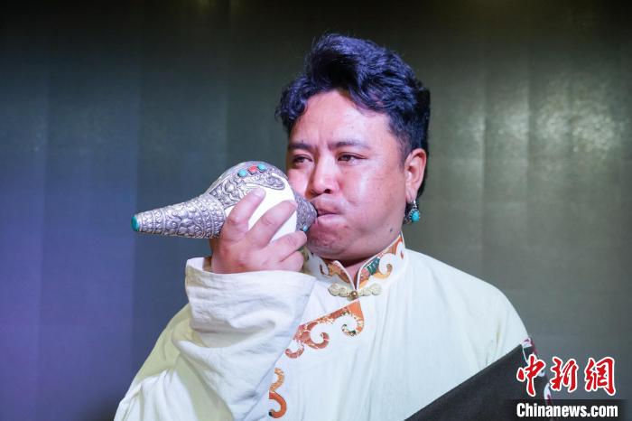 圖為樂團成員吹奏吉祥海螺。馬銘言 攝