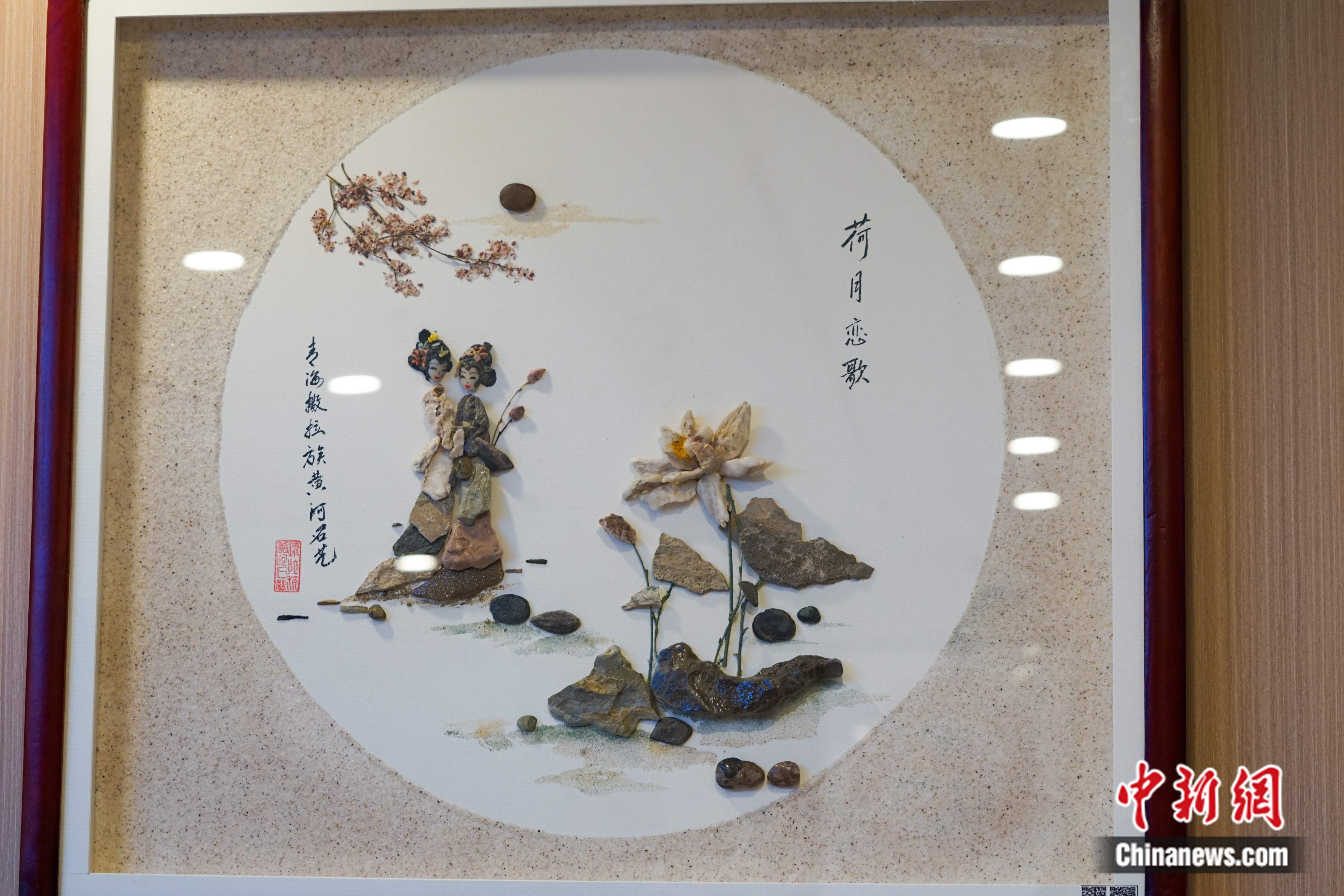 圖為中心內(nèi)懸掛的撒拉族黃河石藝畫。馬銘言攝