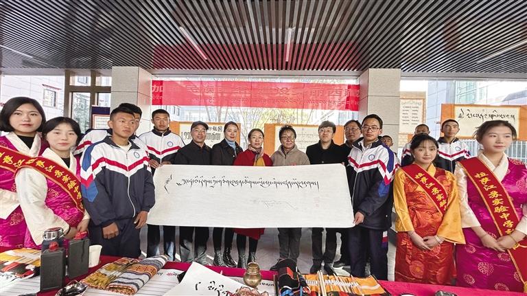 隨后,與會(huì)領(lǐng)導(dǎo)向江蘇實(shí)驗(yàn)中學(xué)贈(zèng)送了150套民族團(tuán)結(jié)進(jìn)步教育讀本。大家一同觀看了書(shū)畫(huà)社同學(xué)現(xiàn)場(chǎng)進(jìn)行的民族團(tuán)結(jié)進(jìn)步書(shū)畫(huà)作品創(chuàng)作。中國(guó)書(shū)協(xié)會(huì)員、自治區(qū)政協(xié)委員、拉薩市政協(xié)常委、區(qū)市書(shū)協(xié)副主席南杰旺扎現(xiàn)場(chǎng)創(chuàng)作了“鑄牢中華民族共同體意識(shí)”的藏文書(shū)法橫幅贈(zèng)送給江蘇實(shí)驗(yàn)中學(xué)。