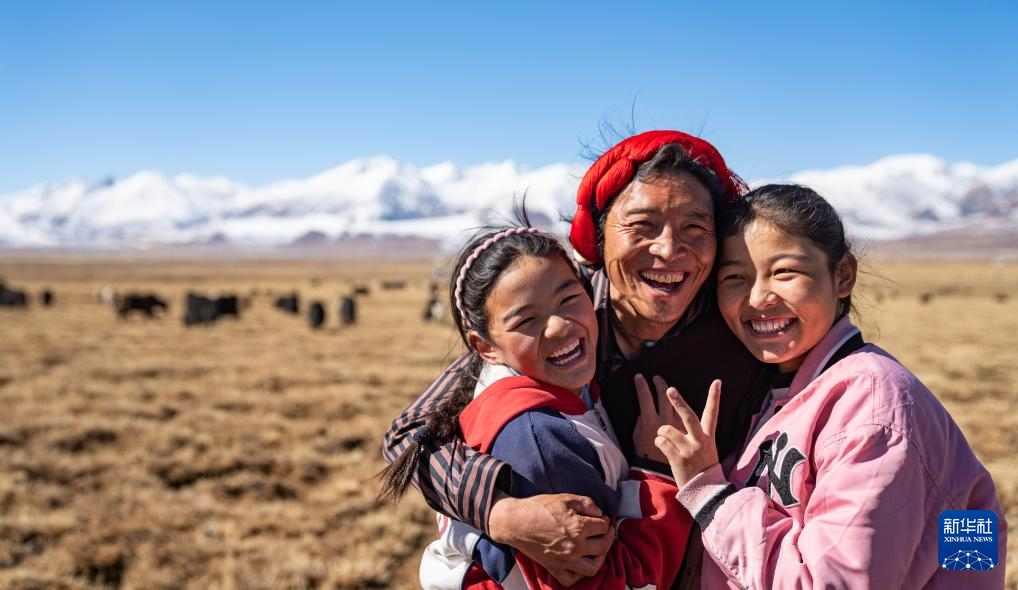 斯曲卓瑪(右)和爸爸、妹妹一起在草原上放牧間隙(11月15日攝)。新華社發(fā)(丁增尼達(dá) 攝)