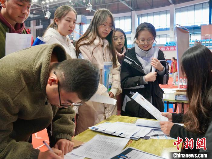 圖為招聘會(huì)現(xiàn)場(chǎng),畢業(yè)生正在填寫(xiě)信息?!⒀?攝