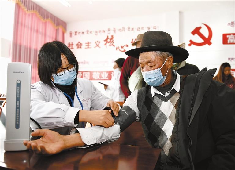 圖為拉薩市青年志愿救援隊(duì)的醫(yī)護(hù)人員為群眾測量血壓。記者 旦增蘭澤 攝