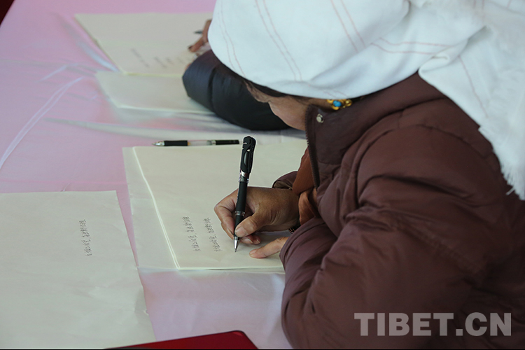 圖為書法比賽獲獎代表現(xiàn)場進(jìn)行了漢藏書法書寫展示。攝影:德吉卓瑪