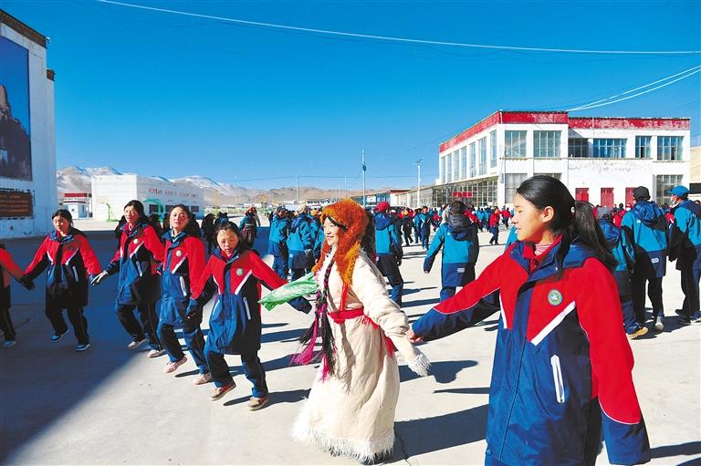 圖為措勤縣中學(xué)學(xué)生在縣藝術(shù)團(tuán)舞蹈演員引領(lǐng)下學(xué)跳“磁石彈舞”。記者 溫凱 攝