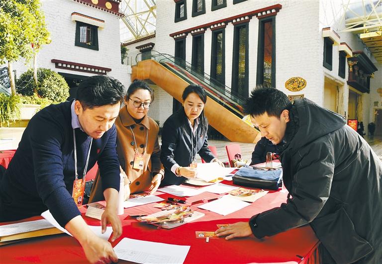 圖為參加西藏自治區(qū)兩會的政協(xié)委員在駐地領取證件和會議資料。記者 旦增蘭澤 攝