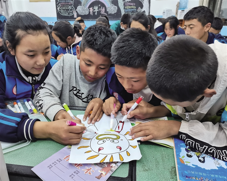從廣州到昌都,交通距離近3000公里,海拔高差3500米。而華南師范大學歷經六屆研究生支教團,28名核心成員與昌都學生心與心緊密相連——他們背起行囊奔赴遠方,在站好三尺講臺之余,還專注于把“抽象”的傳染病防治知識用孩子喜聞樂見、通俗易懂的繪本表現(xiàn)出來,帶領孩子們和“傳染病小怪獸”說再見。