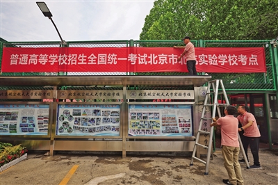 6月6日,記者在北京航空航天大學(xué)實驗學(xué)校中學(xué)部(簡稱“北航實驗學(xué)?!保┛键c看到,學(xué)校西門處已懸掛起高考考點橫幅、考場布置已就位,校園內(nèi)放置了多個溫馨的提示語標(biāo)牌。據(jù)悉,該校是今年新增高考考點之一,承接來自9所學(xué)校277名考生的高考組考任務(wù)。此外,記者還探訪了北京高考人大附中經(jīng)開學(xué)??键c