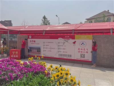 “2024高考加油”“高考就是高高興興地考試”“保持靜心,增強(qiáng)信心,做題專心,考試細(xì)心”……考生一進(jìn)考點,就可以看到這些鼓舞人心的標(biāo)語。走出考點時,一張巨型“圓夢號”頭等艙登機(jī)牌映入學(xué)生眼簾,祝??忌鷤冋钩岣唢w,前程似錦。