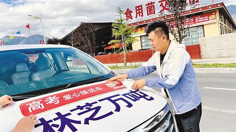 圖為愛(ài)心車(chē)車(chē)主在張貼“愛(ài)心送考車(chē)”貼紙。